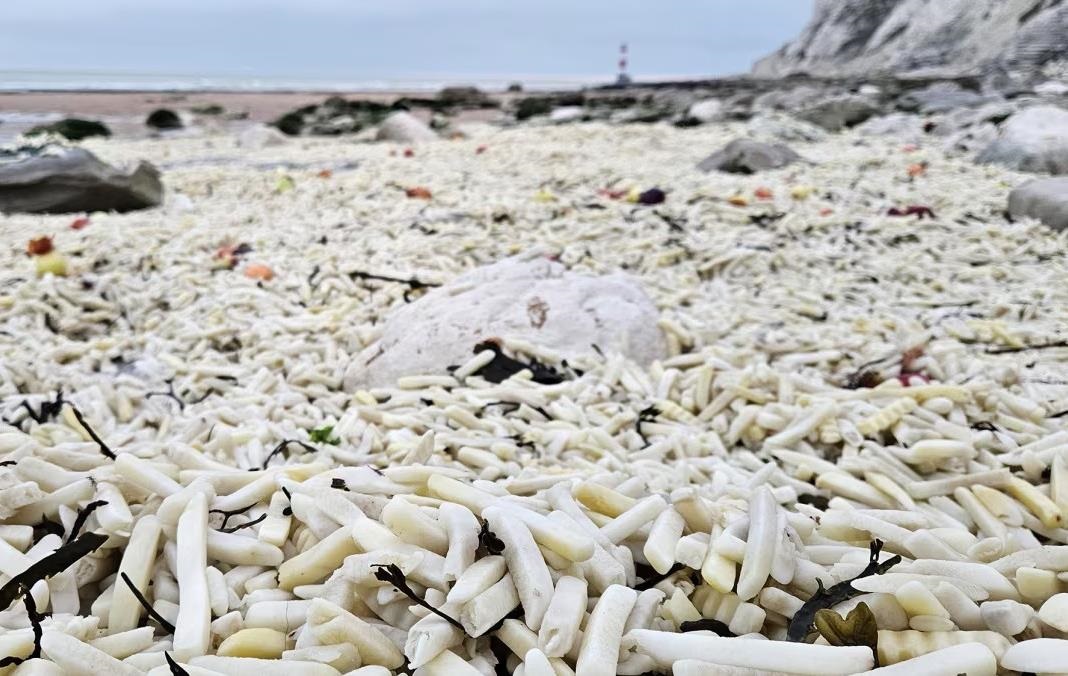 На пляжу на південному сході Англії виявили тисячі кілограмів картоплі фрі та цибулі, які випали з контейнеровозів під час шторму. Пластикове пакування продуктів може стати небезпекою для морських мешканців, які можуть помилити його з їжею. Місцеві мешканці допомагають вивозити сміття з пляжу, щоб запобігти забрудненню моря та його мешканців. Рятувальна компанія виконує евакуаційні операції від імені власника контейнеровоза, який втратив частину вантажу під час шторму.